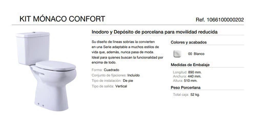 Este inodoro está diseñado para ofrecer máxima comodidad y accesibilidad a personas con movilidad reducida. Cuenta con una altura adecuada que facilita el uso sin esfuerzo. Su estructura robusta asegura durabilidad y resistencia, ideal para instalaciones en baños públicos o privados.