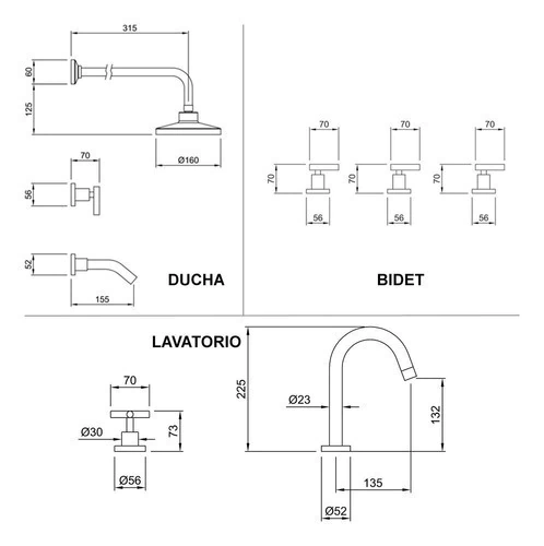 Este kit de grifería incluye todo lo necesario para equipar el lavatorio, el bidet y la ducha. Cada pieza está diseñada para ofrecer un control preciso del flujo y la temperatura del agua, con acabados de alta calidad que resisten el uso diario y aportan un toque de elegancia al baño.
