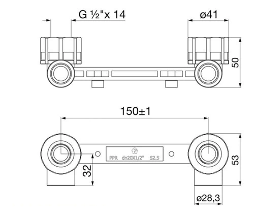 - **Dimensiones:** Apto para caños de termofusión de Ø20 mm, con terminales de rosca G 1/2" x 14 y una separación entre centros de 150 mm, asegurando una instalación sin complicaciones y un ajuste perfecto.